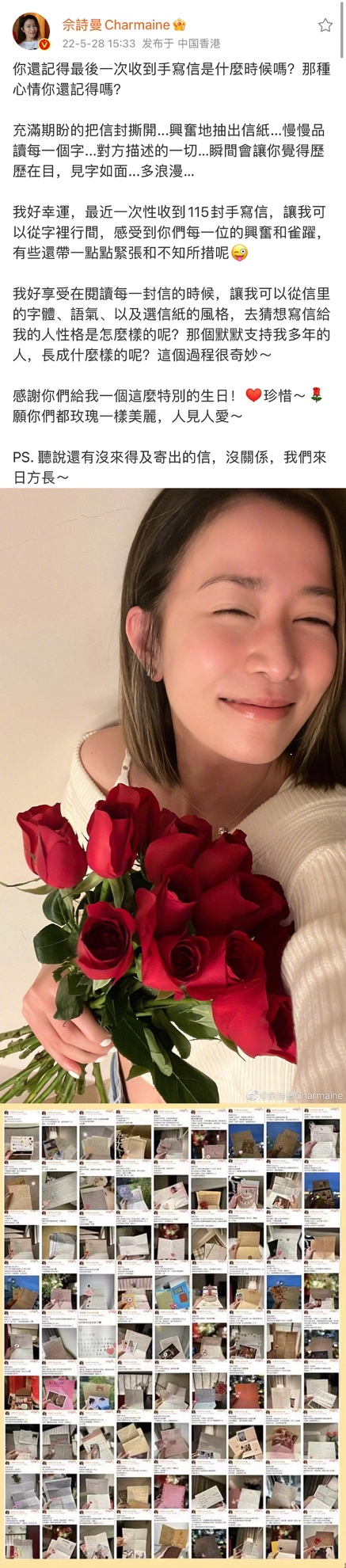 除此之外,#佘诗曼连发百条微博回信#也登陆热搜,连续五个小时发布了115条微博回复粉丝来信,真情实感,没有一条重复,不仅表达了自己的感谢,更有对影迷的鼓励支持与赞美,粉丝在评论区感慨“这就是我们的偶像,以真心换真心”。