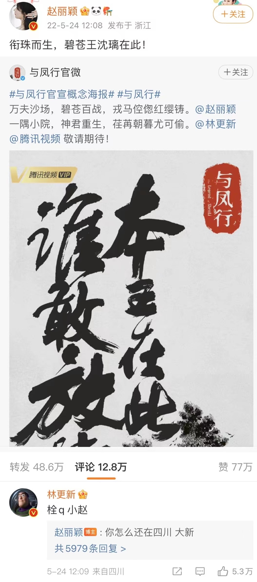 除了星粉互动之外,明星之间的互动也愈加频繁。最近电视剧《与凤行》官宣阵容,林更新现身赵丽颖评论区,留言:“栓q小赵。”赵丽颖回复:“你怎么还在四川,大新。”将#林更新评论赵丽颖#送上热搜,既让观众过了一把《楚乔传》回忆杀的瘾,又为新作《与凤行》带来诸多话题与期待,引发了粉丝的二次传播效应:“爷青回啊。” “有没有人告诉我!《楚乔传2》还有没有可能了啊!”