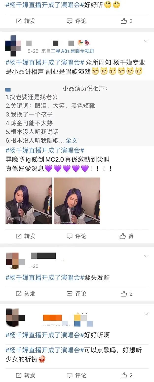 粉丝也在为自己喜欢的偶像“共创”内容:杨千嬅在直播唱歌时,弹幕被“老公”“老婆”刷屏,认真阅读后的杨千嬅表示“给你们笑死了”。随后#杨千嬅直播开成了演唱会#迅速登陆文娱榜榜首。这些IP不仅承载了明星们的音乐表达诉求,又在具有强互动性的内容里打磨出更加清晰的明星个人形象。